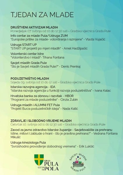 Danas, 7.5.2018., u sklopu Tjedna za mlade, kojeg organizira Grad Pula uz podršku Savjeta mladih Grada Pule, je održan prvi ciklus predavanja s temom "Društveni aktivizam mladih", u prostoru Gradske vijećnice Grada Pule.