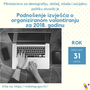 Ministarstvo za demografiju, obitelj, mlade i socijalnu politiku je dana 2.1.2019. izdalo obavijest da je omogućen pristup aplikaciji za unos izvješća organizatora volontiranja.Stoga, ovim putem obavještavamo sve organizatore volontiranja, odnosno sve udruge, ustanove, zaklade i fundacije, druge neprofitne pravne osobe, državna tijela i jedinice lokalne i područne (regionalne) samouprave, koje su tijekom 2018. godine bili ...