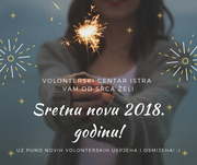 Svim organizatorima volontiranja, volonterima/kama, suradnicima, partnerima i prijateljima, od srca želimo sretnu 2018. godinu, uz puno uspjeha, osmijeha, zdravlja, sreće te novih projekata i novih volonterskih prilika!