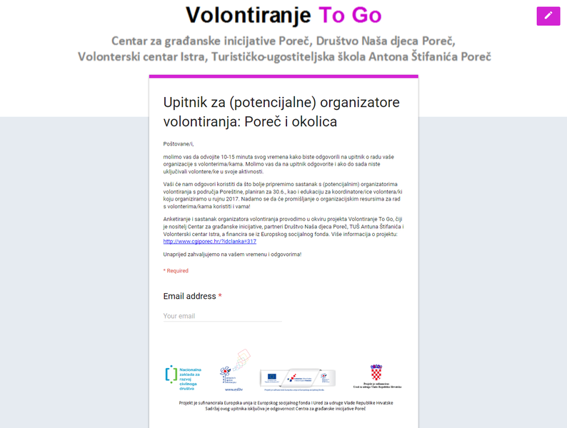 Kako bismo bolje razumjeli kapacitete, iskustva i potrebe neprofitnih organizacija, osmislile smo upitnik za organizatore volontiranja s Poreštine koji je ujedno i iskaz interesa za sudjelovanje na sastanku, a možete ga ispuniti ovdje.
