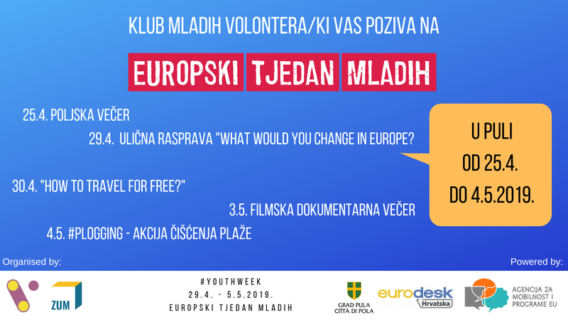 Klub mladih volontera/ki iz Pule, kojeg vode Volonterski centar Istra i Udruga ZUM, poziva sve zainteresirane mlade i druge građane/ke da se pridruže u aktivnostima povodom obilježavanja Europskog tjedna mladih.