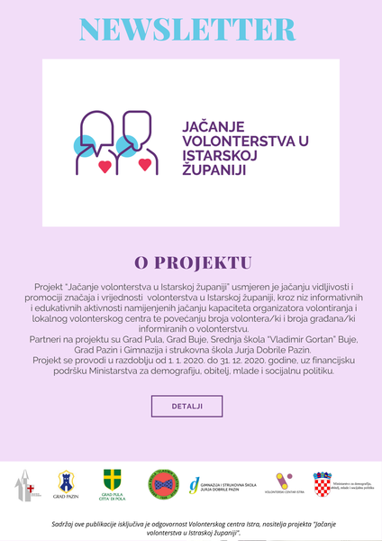 Newsletter je izrađen s ciljem promocije vrijednosti volonterstva, aktualnih događaja u području volonterstva, kao i primjera dobre prakse implementacije volonterskih programa organizatora volontiranja na području Istarske županije i priznavanja kompetencija stečenih volontiranjem.