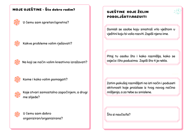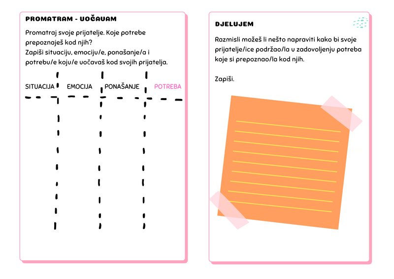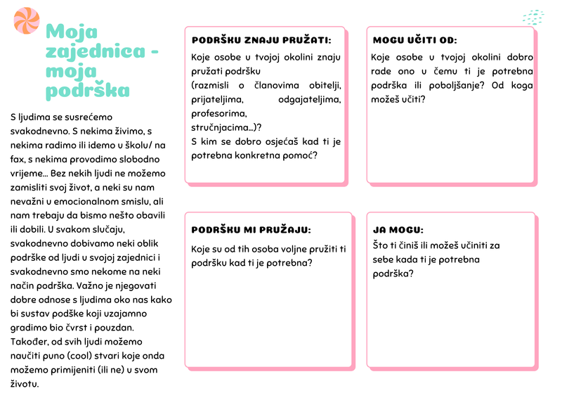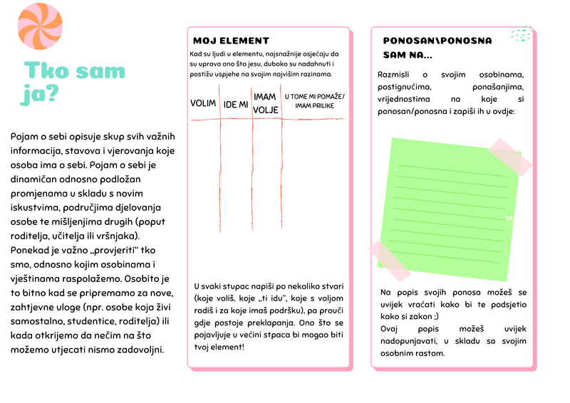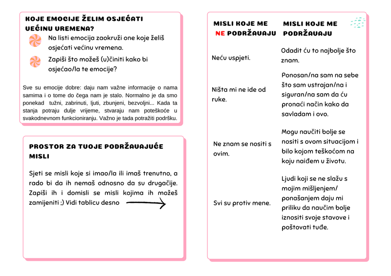 Obzirom da su nas mjere zaštite od bolesti uzrokovane korona virusom spriječile u održavanju ciklusa radionica, a smatrajući kako je pravo vrijeme da pobliže upoznamo sebe i ažuriramo svoju "osobnu iskaznicu" vrlo važnim podacima koji govore tko smo mi, što nam je važno, u što vjerujemo, koje snage imamo, tko nam je podrška itd, osmislile smo set „radnih listova“ s aktivnostima koje podržavaju razvoj, odnosno unaprjeđenje socio-emocionalnih vještina.