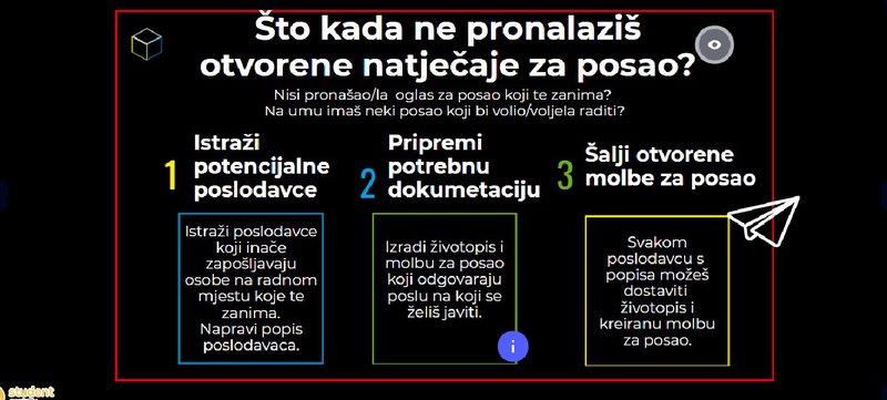 Osim učenicima i svim mladima osobama koji se nalaze u procesu traženja posla, vjerujemo da prezentacija može poslužiti kao edukativni alat nastavnicima i stručnim suradnicima u sadržajima usmjerenim razvoju poduzetničkih kompetencija učenika u okviru obrazovanog sustava.